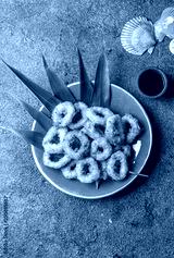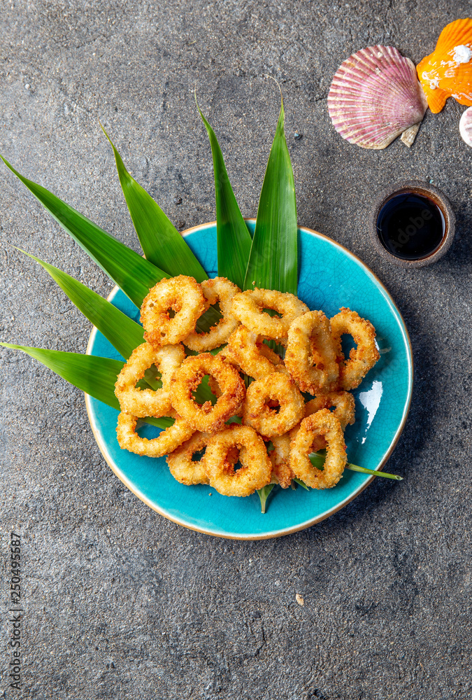 Fried squid rings on blue plate decorated with tropical leaves. Gray concrete background and sea decoration. top view