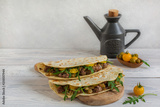 Piadina romagnola - Italian flatbread with sausages (salsiccia), rucola and onion.
