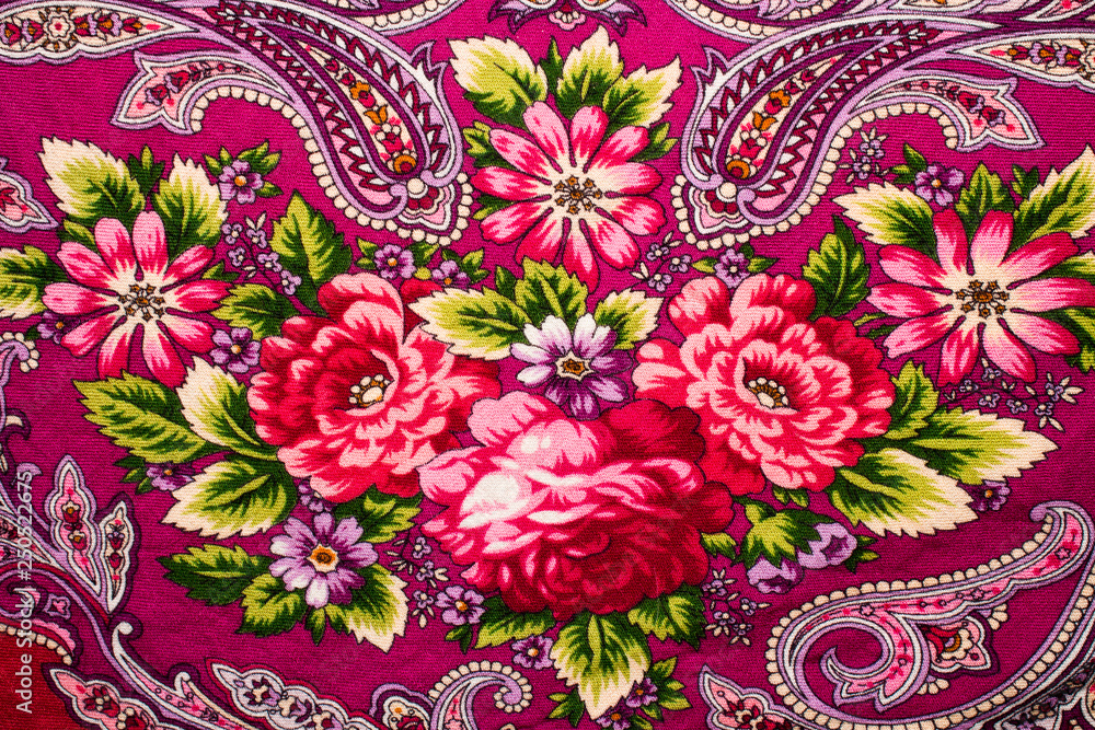 Fabric background with Russian folk patterns and flowers.