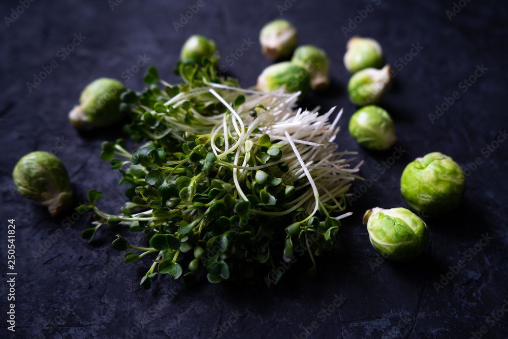 Fresh organic radish microgreens and brussels sprouts isolated on black background. Healthy raw radish sprouts. Nutrition.
