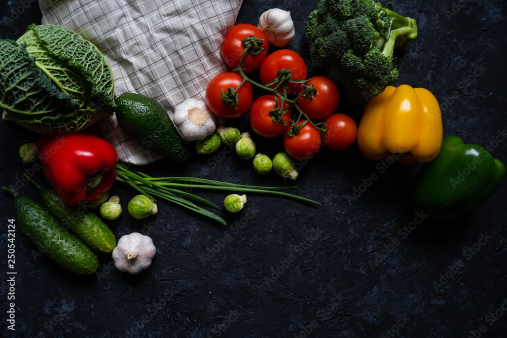 Fresh raw farmer vegetables isolated on black stone background. Flat lay. Healthy organic food. Space for text