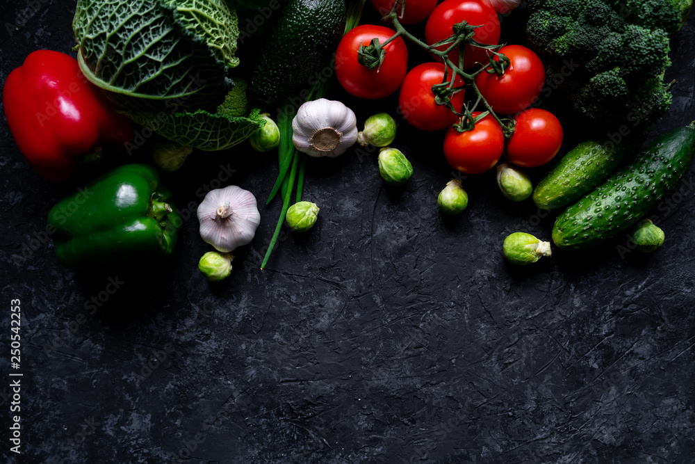 Composition of fresh farmer vegetables isolated on black background. Raw Healthy organic food. Cabbage, tomatoes, cucumber, pepper, broccoli. Flat lay. Vegetarian