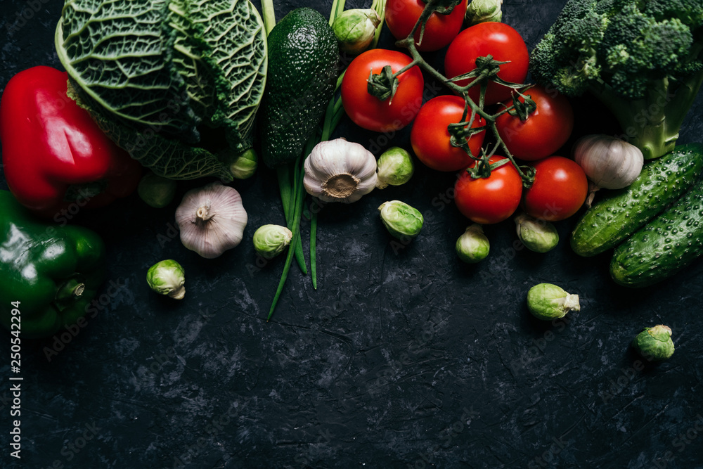 Fresh organic vegetables isolated on black background. Raw food. Cabbage, tomatoes, cucumber, pepper, broccoli. Flat lay. Vegetarian. Copy space