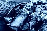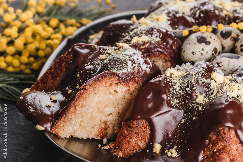 Easter cake with chocolate, coconut, spring flowers, quail eggs on a dark stone background. Happy Easter celebration