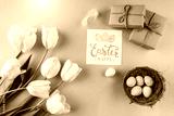 Easter eggs in nest and tulips flowers on spring background. Top view with copy space. Happy Easter card.