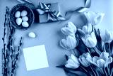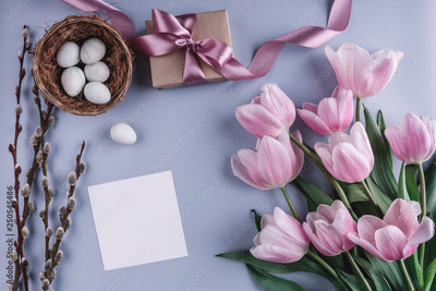 Easter eggs in nest and tulips flowers on blue background with card and gift. Happy Easter. Top view with copy space