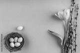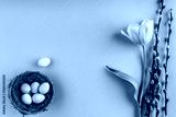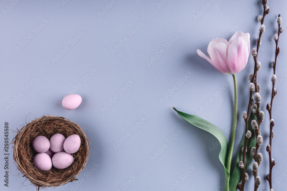 Easter eggs in nest and tulips flowers on spring background. Top view with copy space. Happy Easter card.