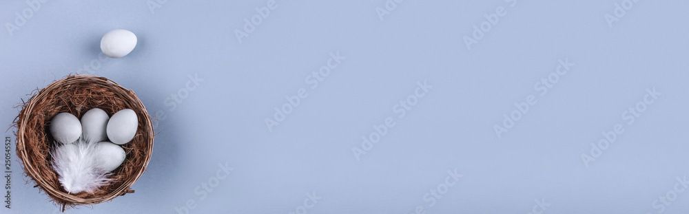 Easter eggs in nest on blue background. Top view with copy space. Happy Easter card