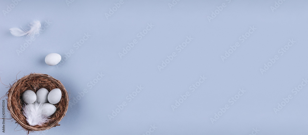 Easter eggs in nest on blue background. Top view with copy space. Happy Easter card