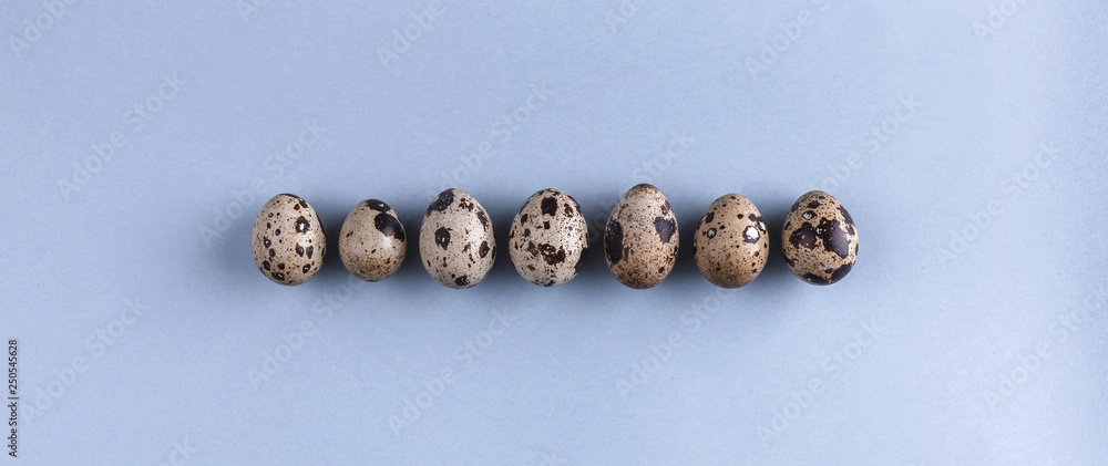 Quail eggs on holiday background. Top view with copy space. Happy Easter card
