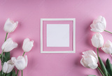 White tulips flowers on pink background with frame for letter. Waiting for spring. Happy Easter card. Flat lay, top view.