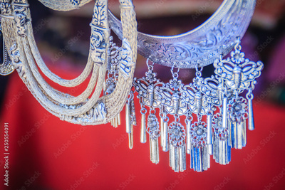 Beautiful traditional Hmong hill tribe silver ornaments for sale as souvenir at Doi Pui’s Hmong ethnic hill-tribe village, Chiang Mai, Thailand.