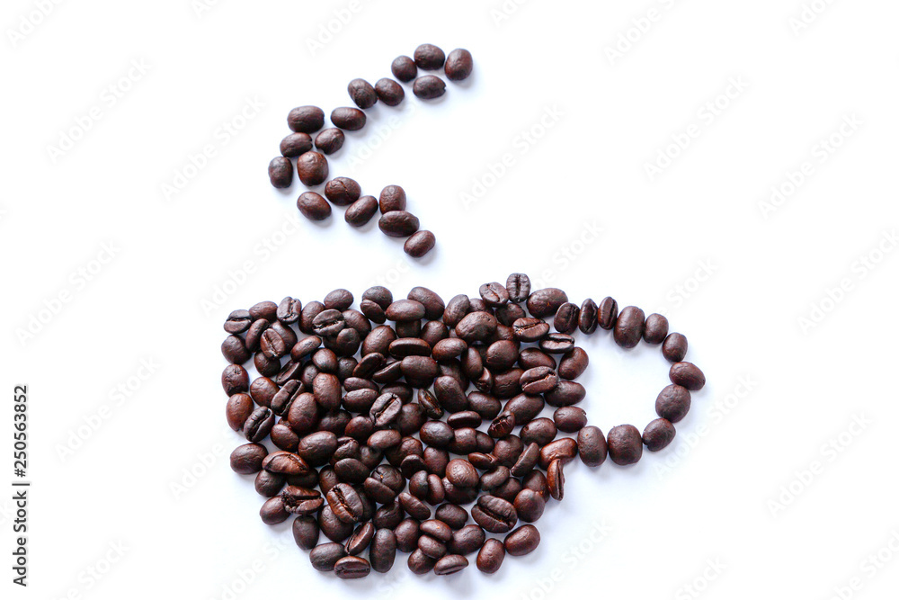 Roasted coffee beans scattered into a shape of a cup