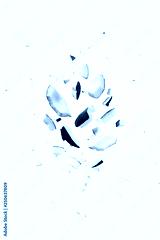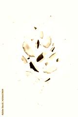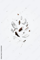 Flying pieces of coconut on white color. Exotic levitation concept for cosmetics, spa, perfume, health care products, aroma background with copy space