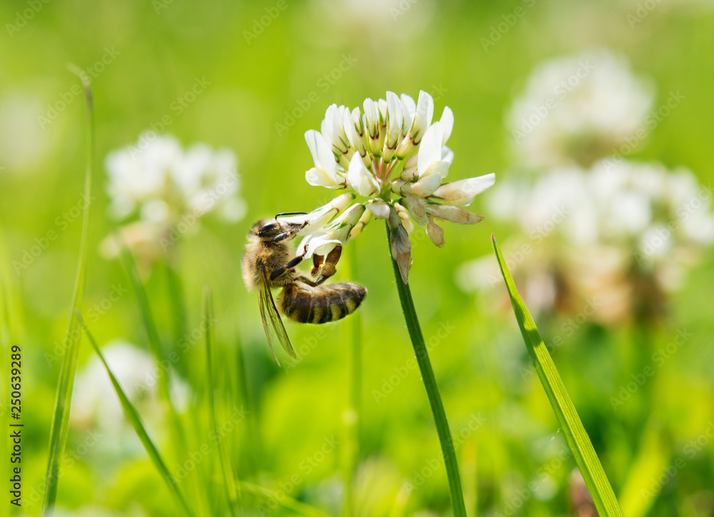 Biene Klee bee clover white lawn garden garten rasen wiese natur nature green grün frühling spring white weiss honey honig sucking