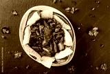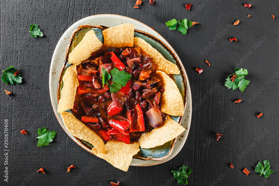 Red bean with nachos or pita chips, pepper and greens on plate over dark background. Mexican snack, Vegetarian food, top view, flat lay, copy space
