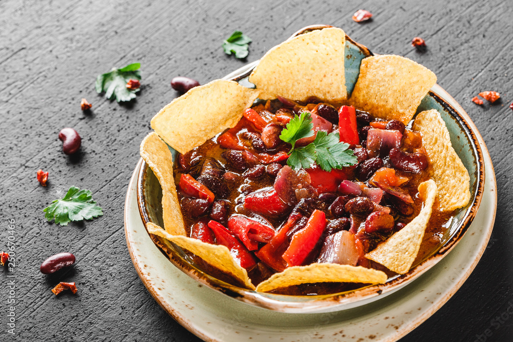Red bean with nachos or pita chips, pepper and greens on plate over dark background. Mexican snack, Vegetarian food