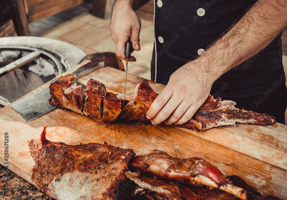 Chef Hands cutting whole grilled lamb for steaks with knife on cutting board. Hot Meat dishes