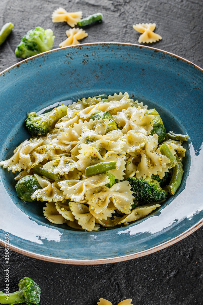 Vegan Farfalle pasta in a spinach sauce with broccoli, brussels sprouts, green beans in plate on dark stone background. Top view, Flat lay. Vegetarian food