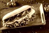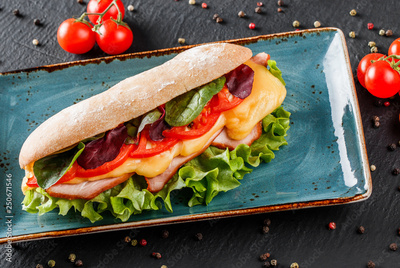 Fresh sandwiches with ham, cheese, bacon, tomatoes, lettuce in plate on dark stone background. Healthy lunch