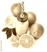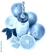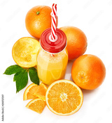 Fresh orange juice with fruit and green leaves in glass can straw, isolated on white background clipping path included.