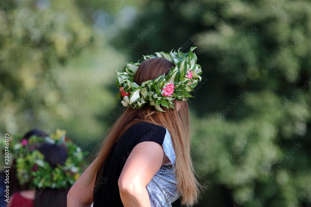 Young girl with long brown hair stands on her side, head decorated with beautiful wreath made of fresh flower, plants, greenery, in background another girld head with wreath in soft focus, greenery