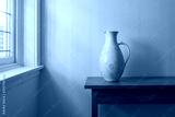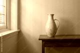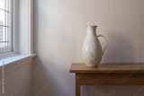 White ceramic jug on oak table next to window with shadows against neutral wall background