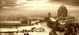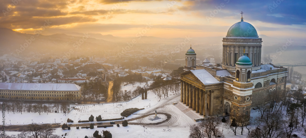 Esztergom, Hungary - Aerial panoramic view of the snowy Esztergom Basilica on a foggy winter sunrise