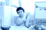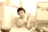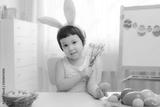 Little girl in bunny ears are playing with Easter eggs. Kids celebrating Easter.
