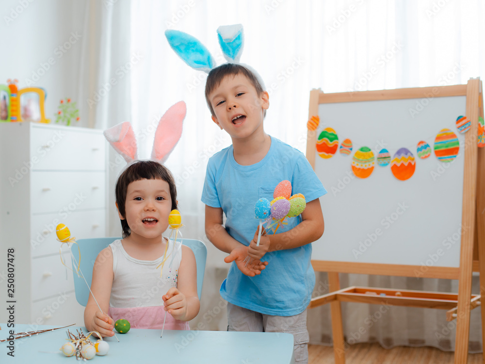 Little boy and girl in bunny ears are playing with Easter eggs. Kids celebrating Easter.