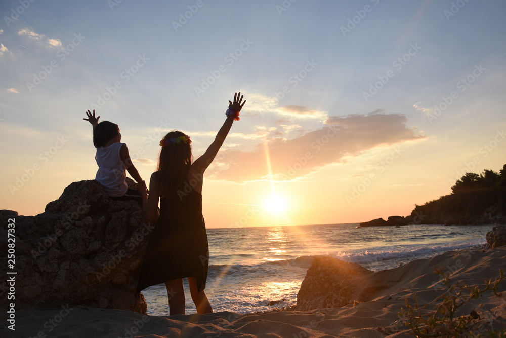 Mother and son playing on the beach at the sunset time. Concept of family life and summer vacations