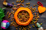 dry cat food in bowl on wooden background top view