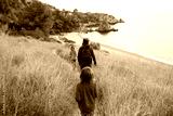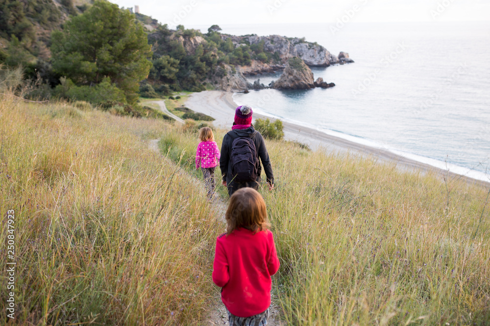 Family walking on the Andalusian beach in winter, Cala del Cañuelo, Spain
