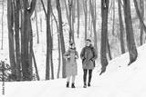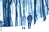 Tourists with backpacks walking at the winter snowy forest and admiring of the landscapes