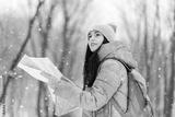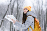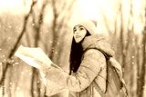 Brunette girl wearing grey jacket and yellow hat holding map and considers a lanscapes while walking with backpack in the winter snowy forest
