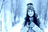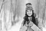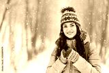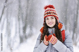 Tourist brunette girl wearing grey jacket, hat and mittens smiling and holding thermo cup in the winter cold forest