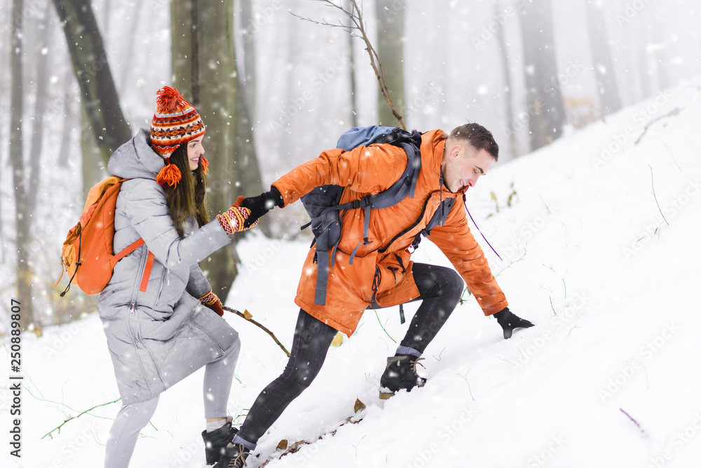Blonde guy wearing orange jacket helps the girl to climb to the mountain in the winter forest
