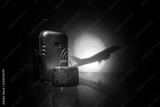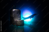 stack of traveling luggage in airport terminal and passenger plane flying over sky