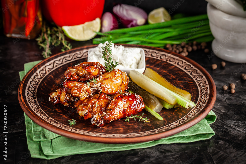 Fried glazed chicken wings in soy sauce and sesame. Cheese white sousa. Marinated vegetables on a ceramic plate. Background image. copy space