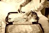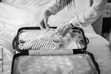 tourism, business trip, people and luggage concept - close up shot of female hands packing things for a new journey in suitcase.