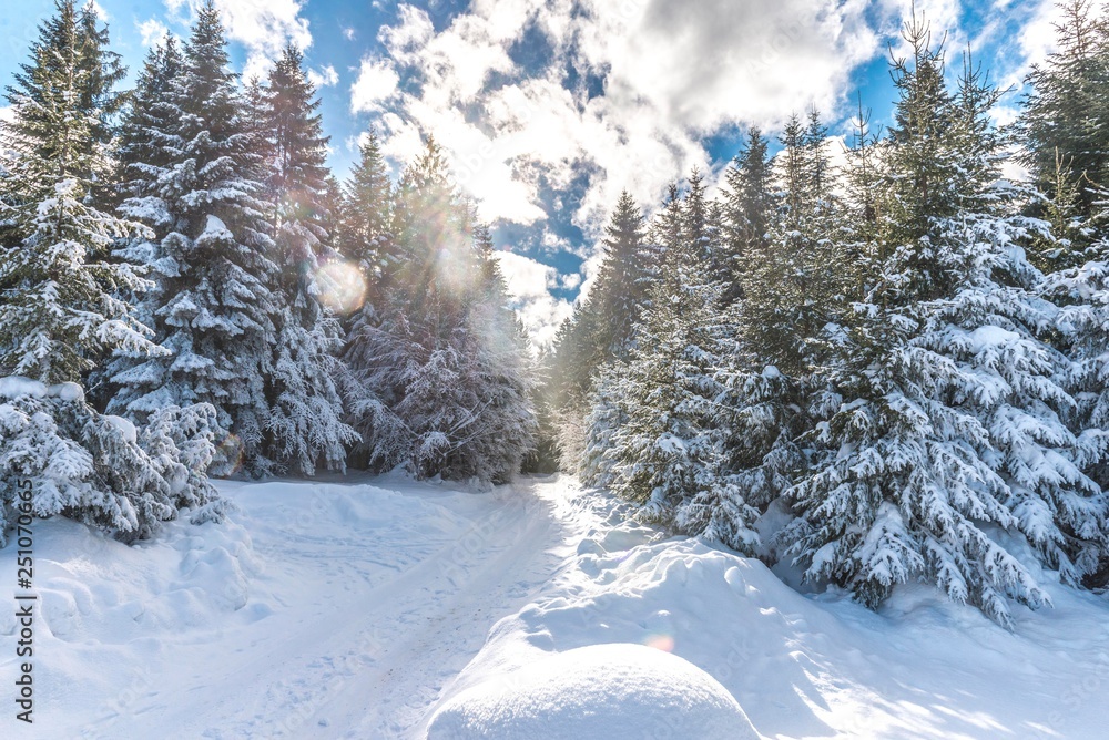Snow mountain woods with pine trees and blue clouds with sunshine light.
