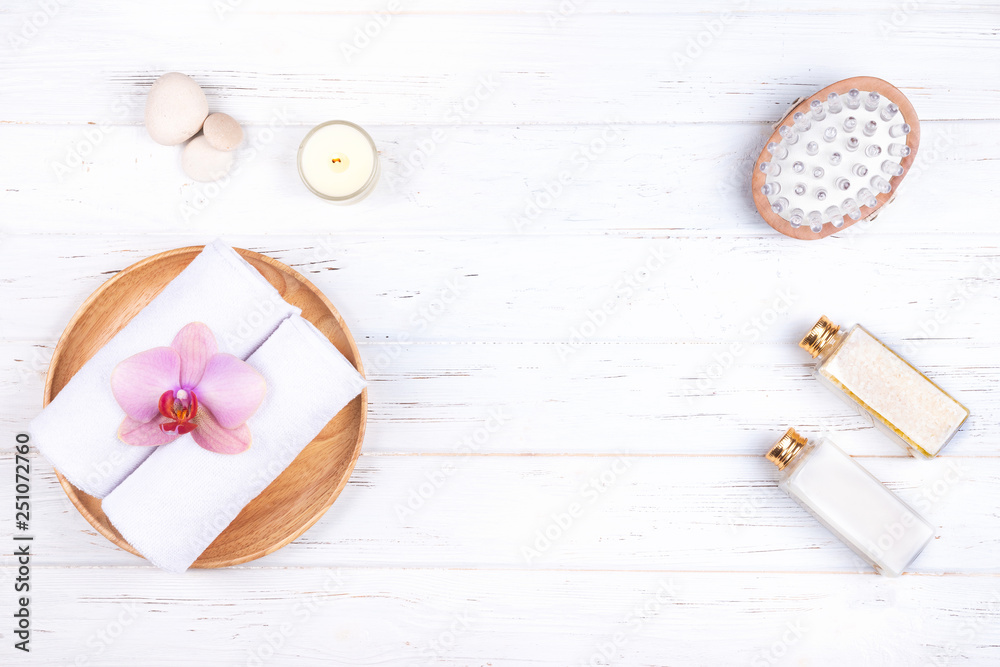 Composition of different spa, beauty and wellness products on white wooden background.