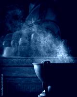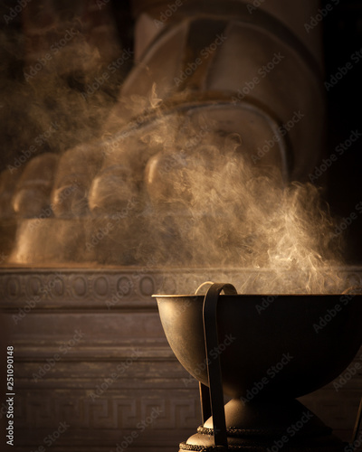 incense burning in an ancient roman cauldron at the foot of the god Zeus
