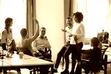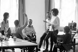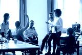 Team leader sharing ideas with colleagues in meeting