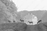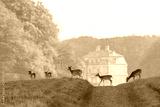 Fallow Deer, Dama dama, females and fawns crossing the dirt road in Dyrehave, Denmark. The Hermitage Palace out of focus in the background.