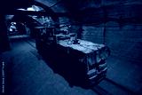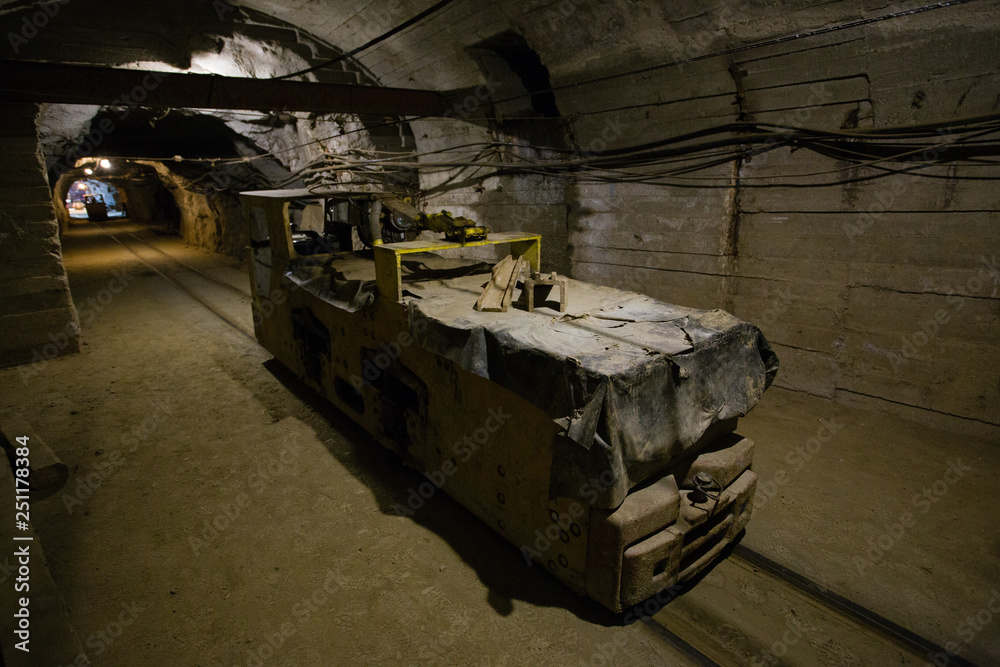 Underground gold ore mine shaft tunnel gallery passage with electric locomotive
