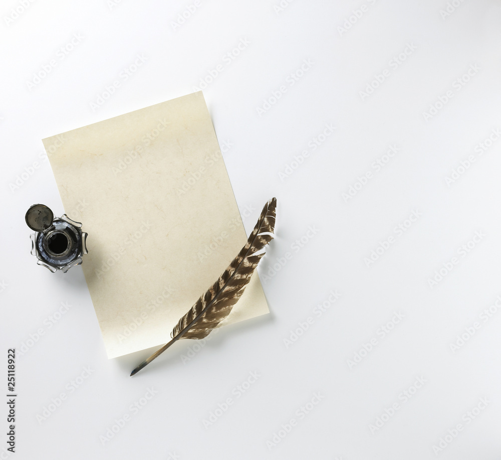 blank letter, ink and feather quill on a white background