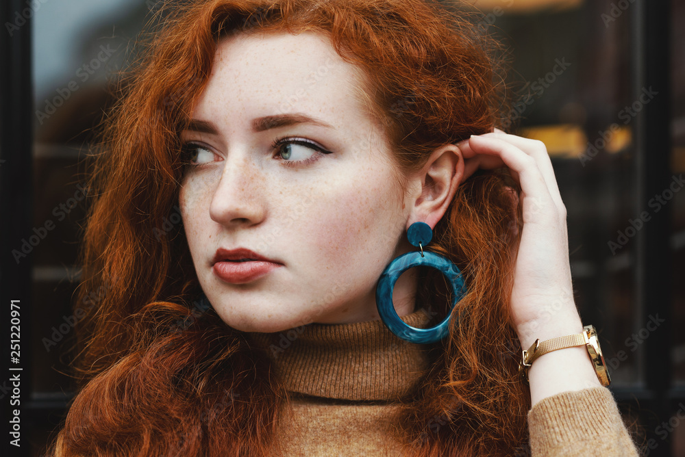 Outdoor close up portrait of young beautiful redhead girl with natural long curly hair and feckled skin, wearing big blue plastic circle earrings, looking aside, posing in street