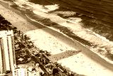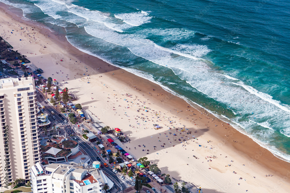 Aerial view of people on Surfers Paradise ocean beach in Queensland, Australia