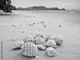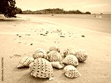 Unusual seashells on the white sand on the coast of the sea the color of azure, Thailand.